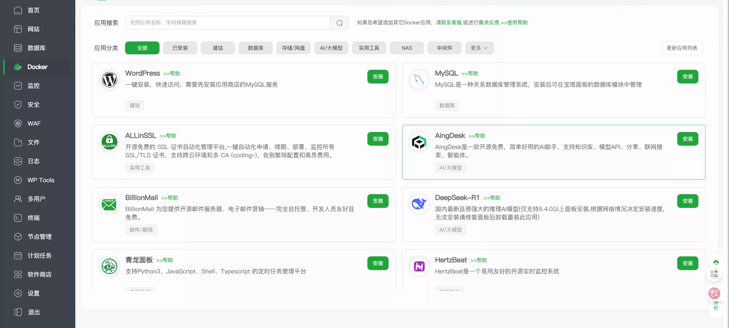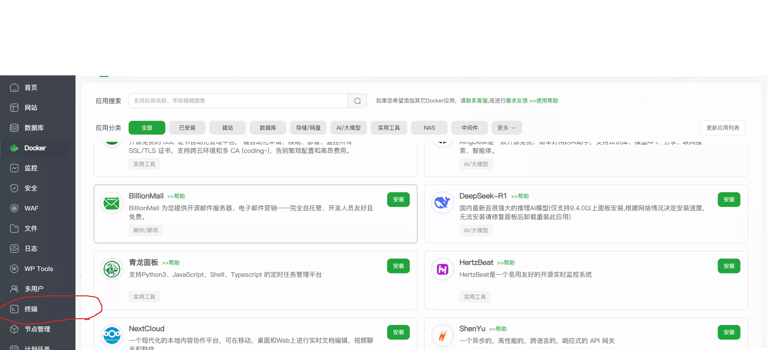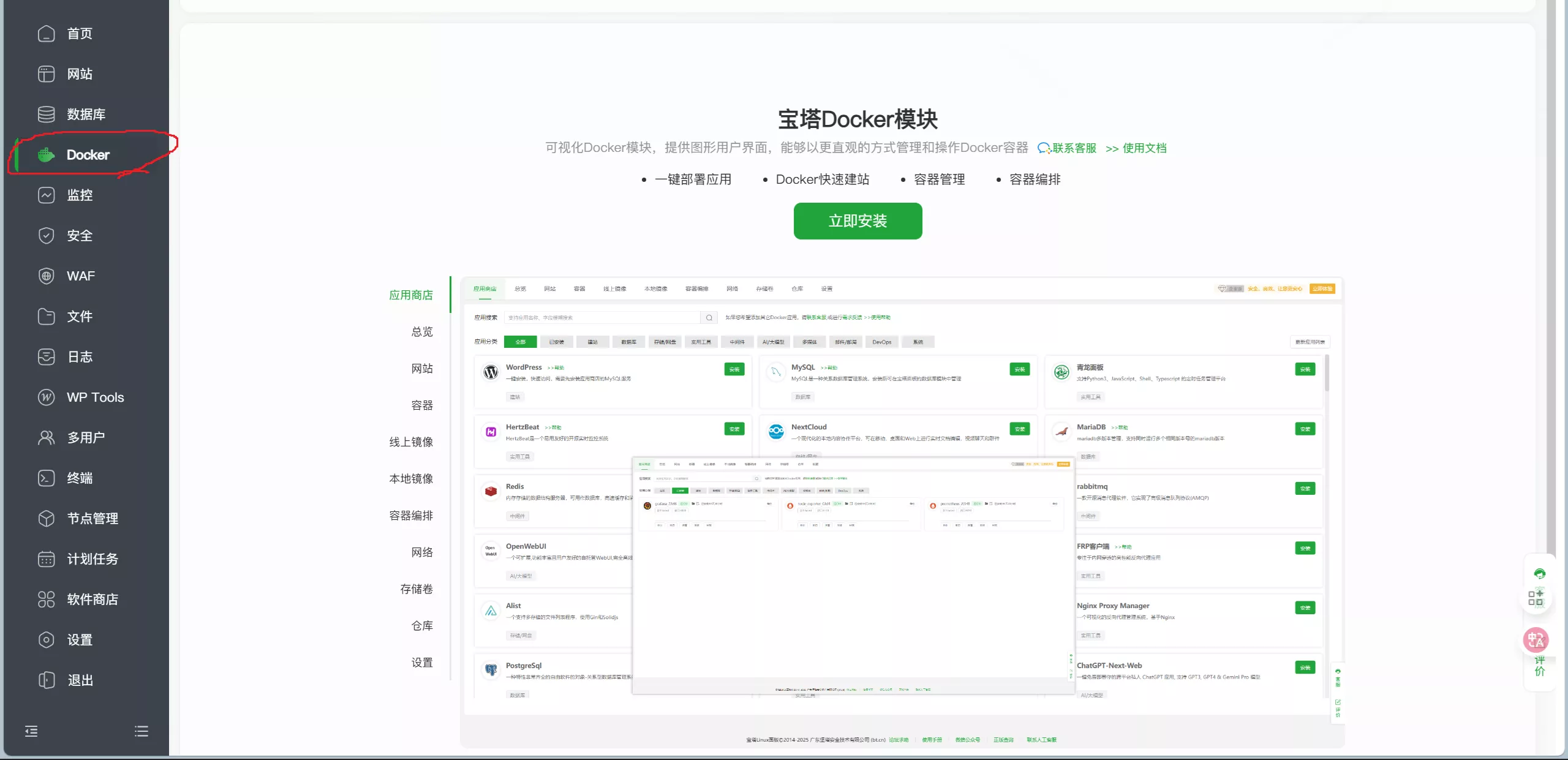 lychee需要通过docker进行安装,所以我们要先在面板中安装docker。新版的宝塔面板中,docker被放到了左边的菜单栏。