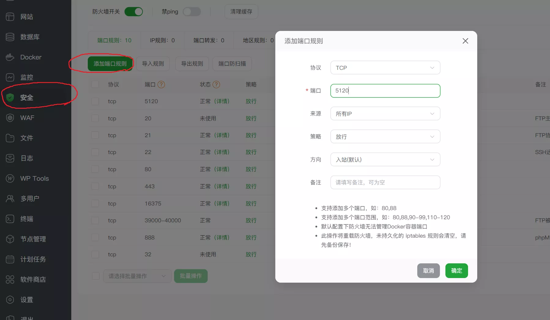 在安全板块,点击添加端口规则,然后放行5120端口。