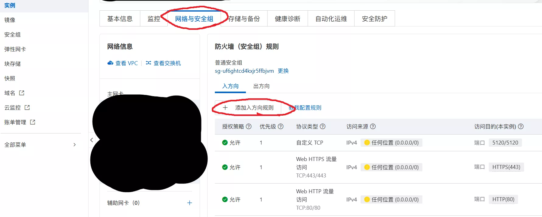 在服务器的实例中选择网络与安全组,然后添加入方向规则。