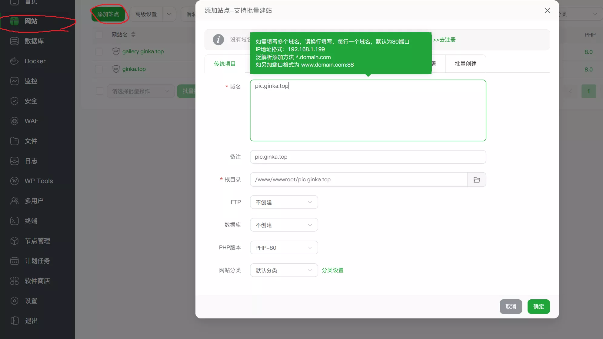 回到宝塔面板中,进入网站板块,点击添加站点。我这里填写的域名是子域名,如果你也填写的是子域名的话别忘了在服务器中进行域名解析。