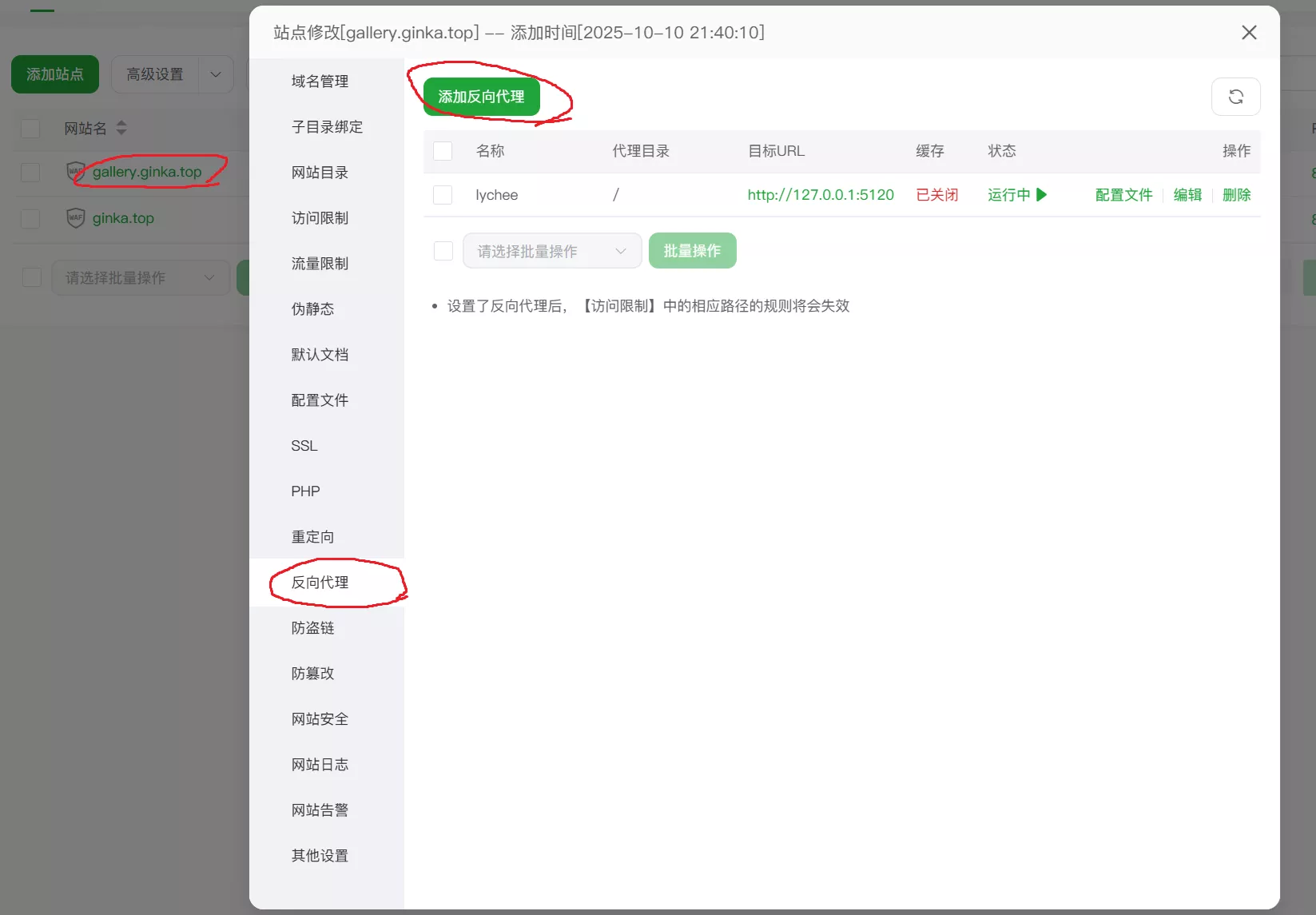 点击网站的名称进入域名设置,点击反向代理,添加反向代理