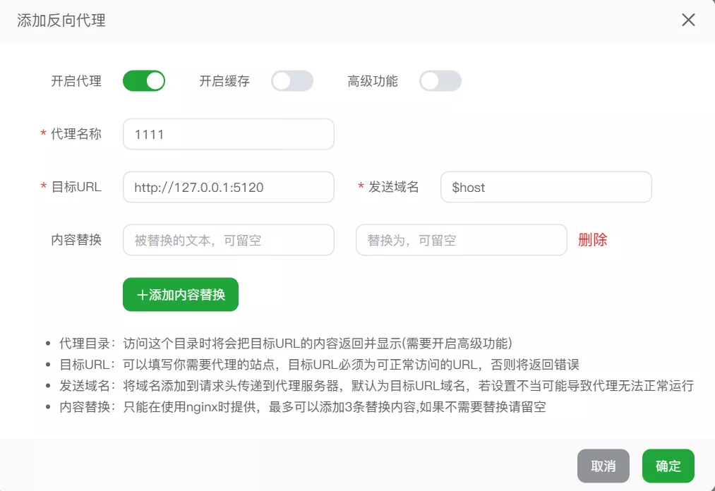代理名称随意写,目标URL填写http://127.0.0.1:5120,发送域名填写$host。