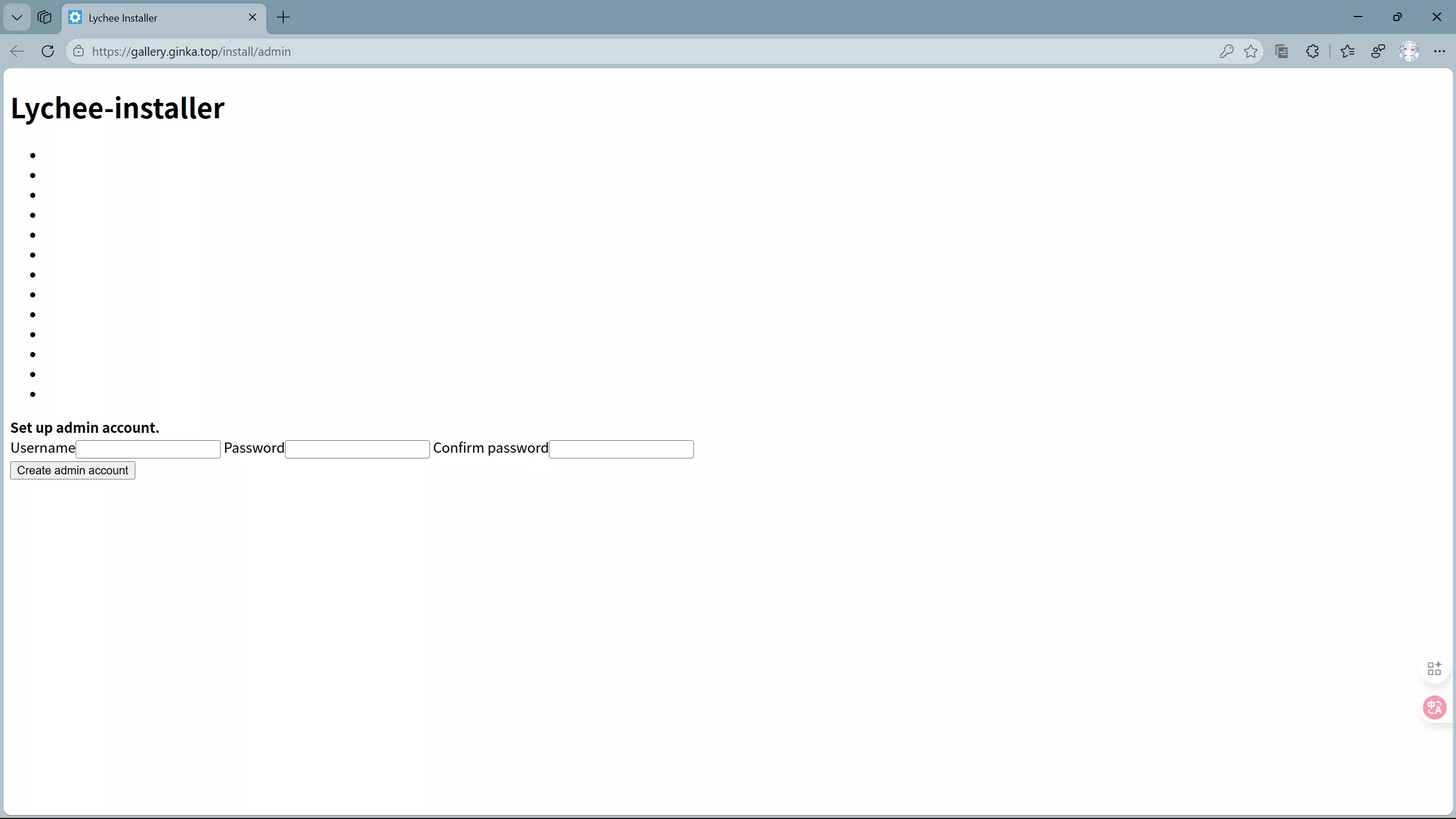 到此为止,Lychee的搭建理论上已经完成了。但当你输入自己的网址时,出现的不是正确的安装页面。